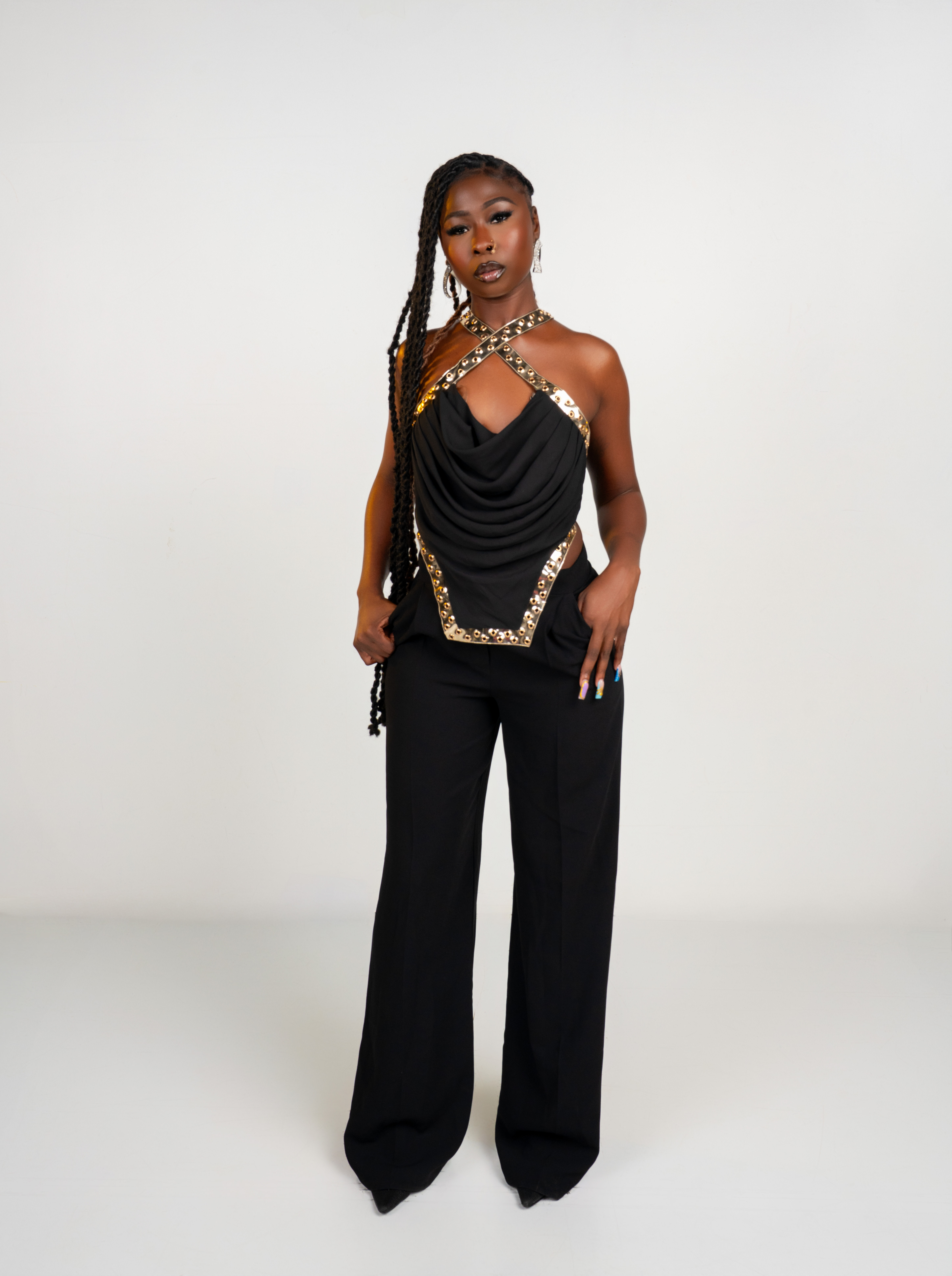 This a striking floor length lavender gown that radiates elegance and drama. It has a modest high neckline balanced by a bold front lace opening that runs vertically down the chest, adding a modern and edgy touch. The cold shoulder cutouts are exposed with precise cutouts, lending a chic and slightly sultry flair. The sleeves are exaggerated and flowing creating a regal and dramatic silhouette. With a sparkling silver belt that cinches the waist, adding definition and glamorous focal point perfect for red carets and formal events.