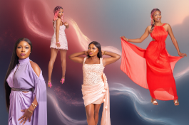This is a striking fashion-forward piece in a bright yellow hue that immediately stands out. Its design blends structure with playful and artistic detailing. The top is form fitting with a structured, strapless-like corset style that smooths the torso and emphasizes the waistline. The underlayer is short, fitted and mini that adds a sleek modern foundation. Flowing from the shoulders and waist are long string like fringes adorned with 3D floral appliques. These cascading stands create movement, texture, and a whimsical, avant-gaedw effect almost resembling vines and petals.