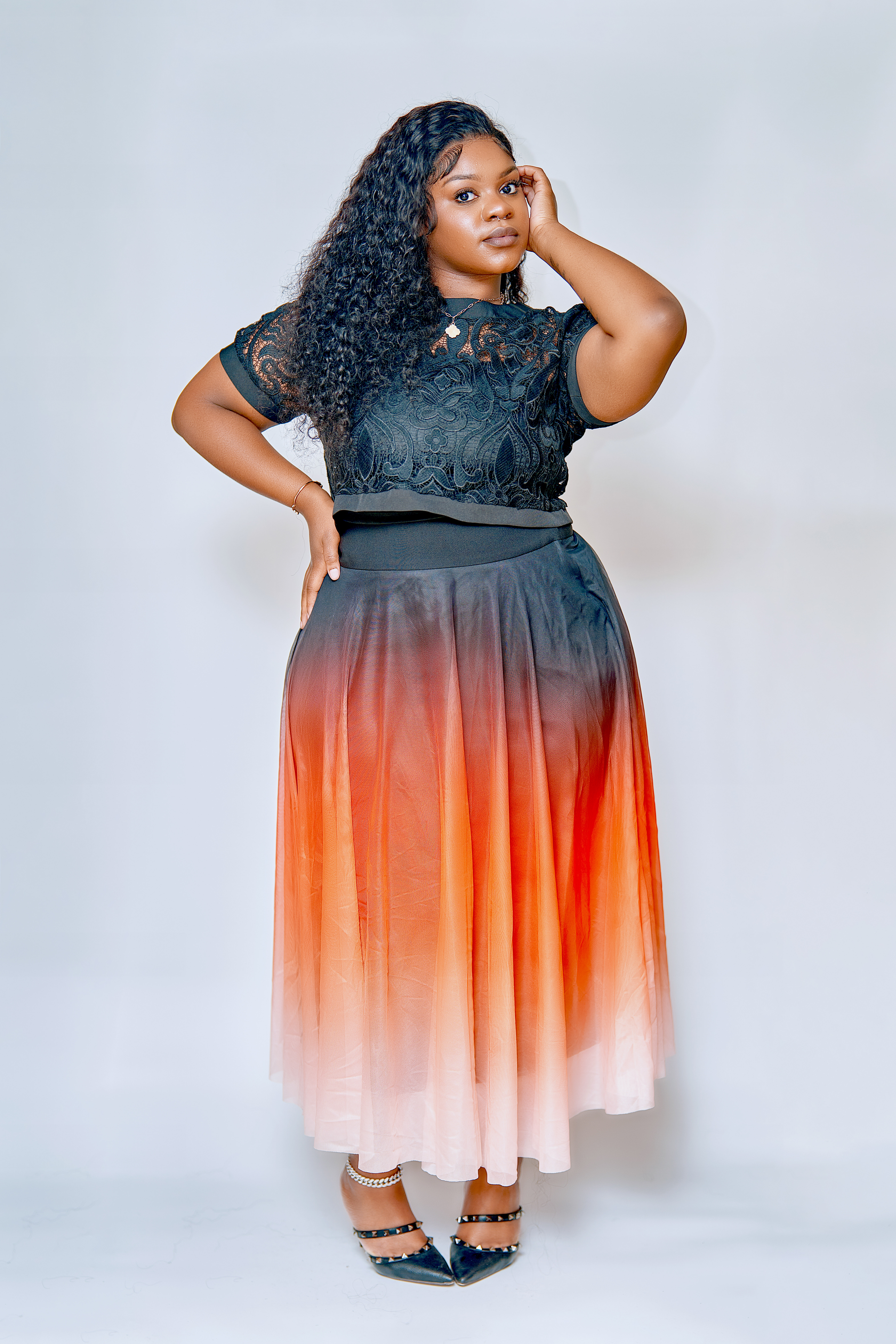 This is a striking fashion-forward piece in a bright yellow hue that immediately stands out. Its design blends structure with playful and artistic detailing. The top is form fitting with a structured, strapless-like corset style that smooths the torso and emphasizes the waistline. The underlayer is short, fitted and mini that adds a sleek modern foundation. Flowing from the shoulders and waist are long string like fringes adorned with 3D floral appliques. These cascading stands create movement, texture, and a whimsical, avant-gaedw effect almost resembling vines and petals.