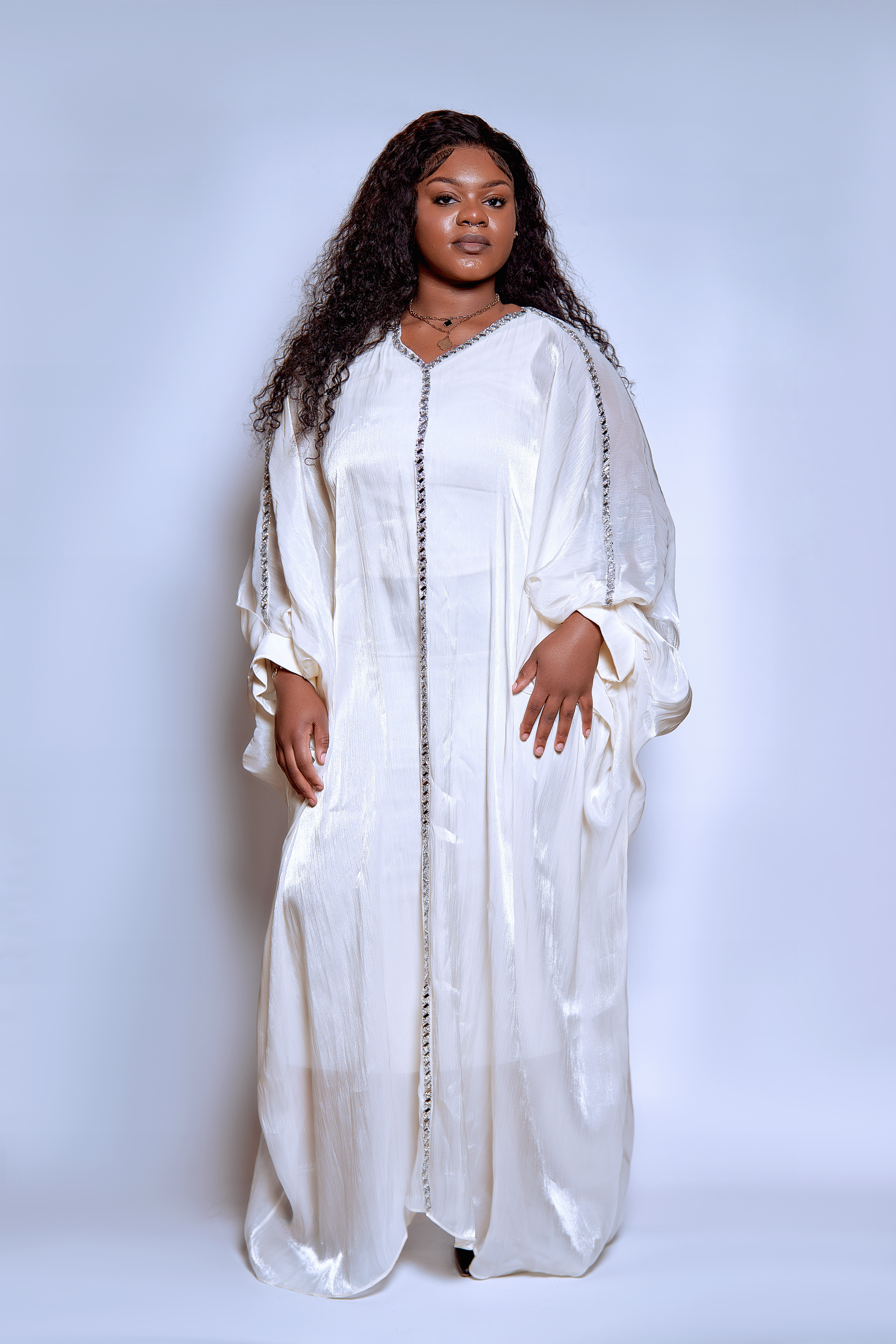This is a modern and red carpet ready dress full with glamour. It is a fitted, sleeveless mini dress that hugs the body with a square neckline and wide shoulder straps. The body of the dress is made of light orange embellished fabric adorned with beaded details to add sparkles. The satin sash draped across the waist, gathered to one side and finished with a voluminous fabric flower.